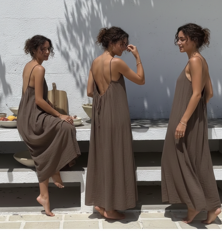 A silhouette of bared skin and soft whispers, designed for the quiet intimacy of home. An open back meeting a gentle embrace, and the rhythmic ease of a heartbeat in every movement.